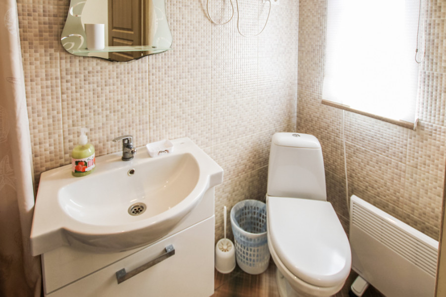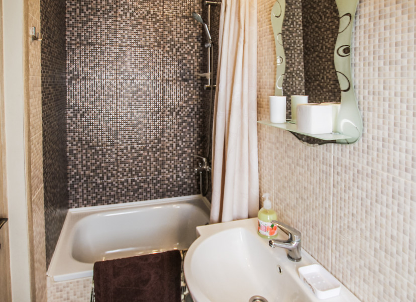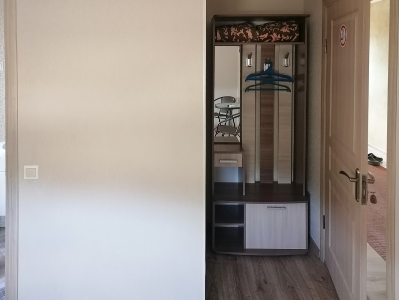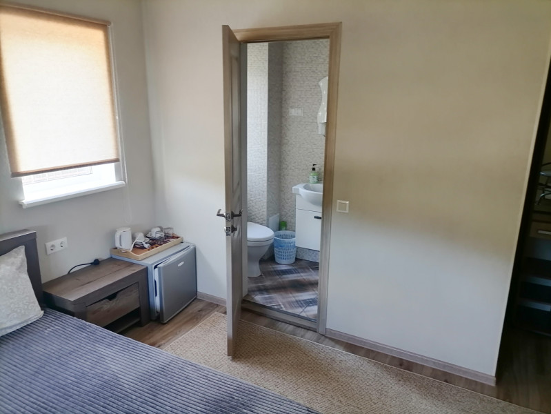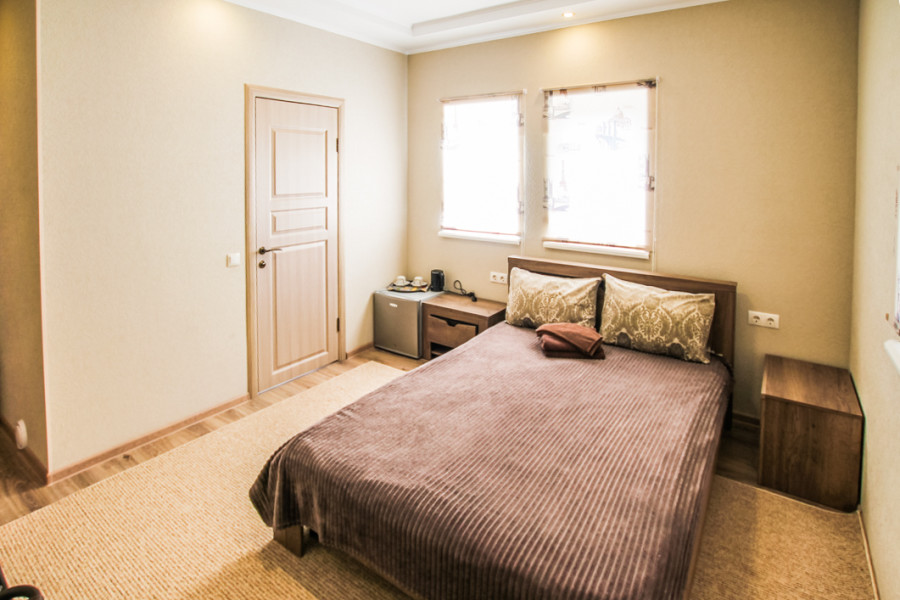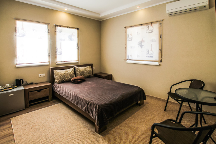 Светлый номер с двухместной кроватью, возможно установить дополнительное место. В номере душ, туалет, телевизор, климат-контроль, холодильник, стол, стулья.