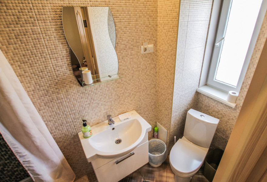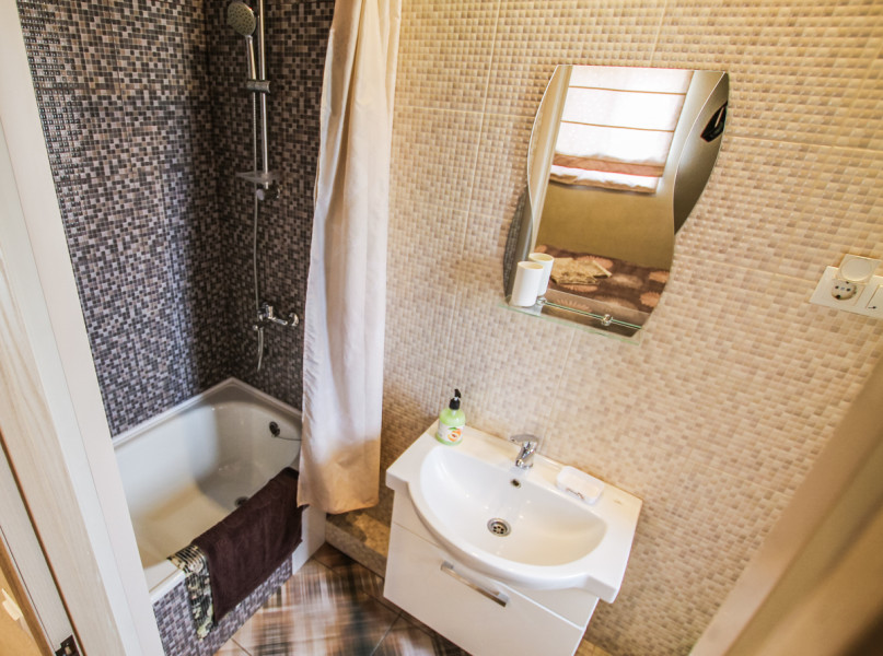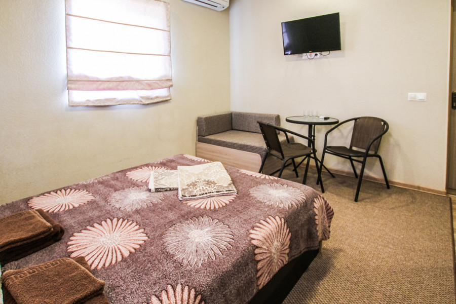 Номер с двухместной кроватью и минидиваном, возможно установить дополнительное место. В номере душ, туалет, телевизор, климат-контроль, холодильник, стол, стулья.