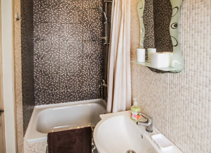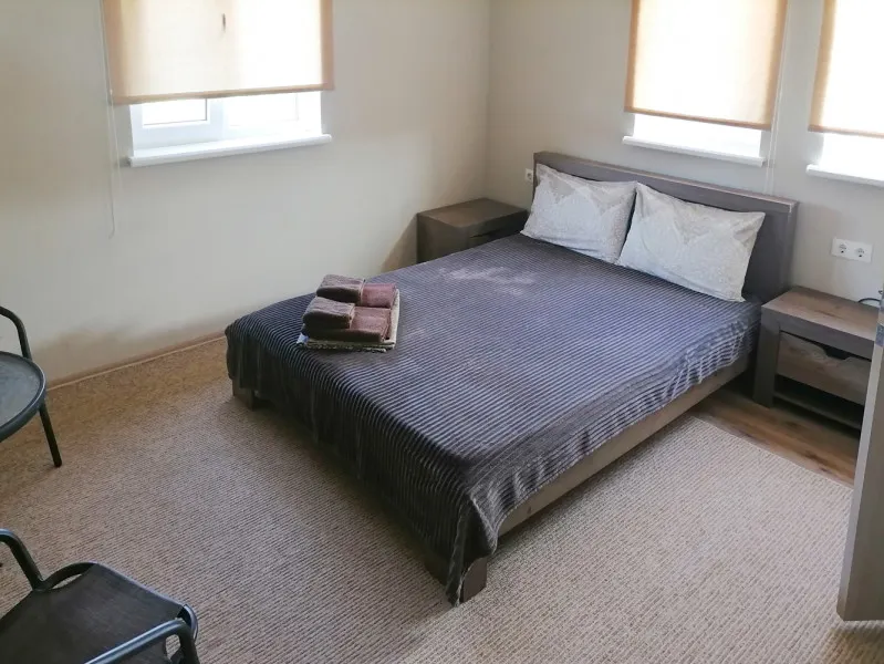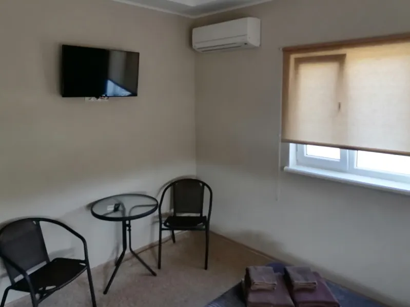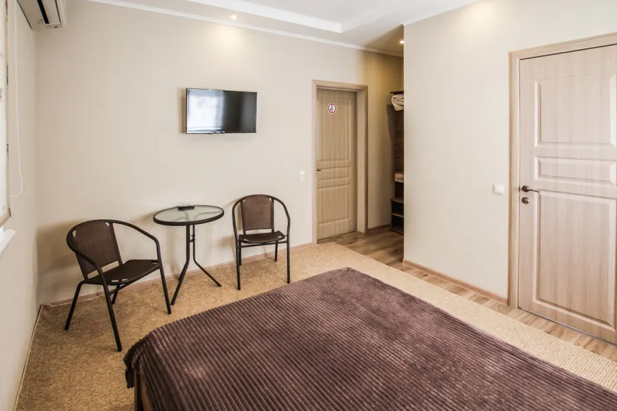 Светлый номер с двухместной кроватью, возможно установить дополнительное место. В номере душ, туалет, телевизор, климат-контроль, холодильник, стол, стулья.