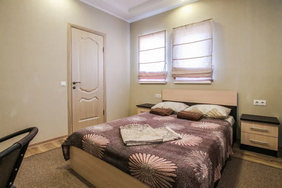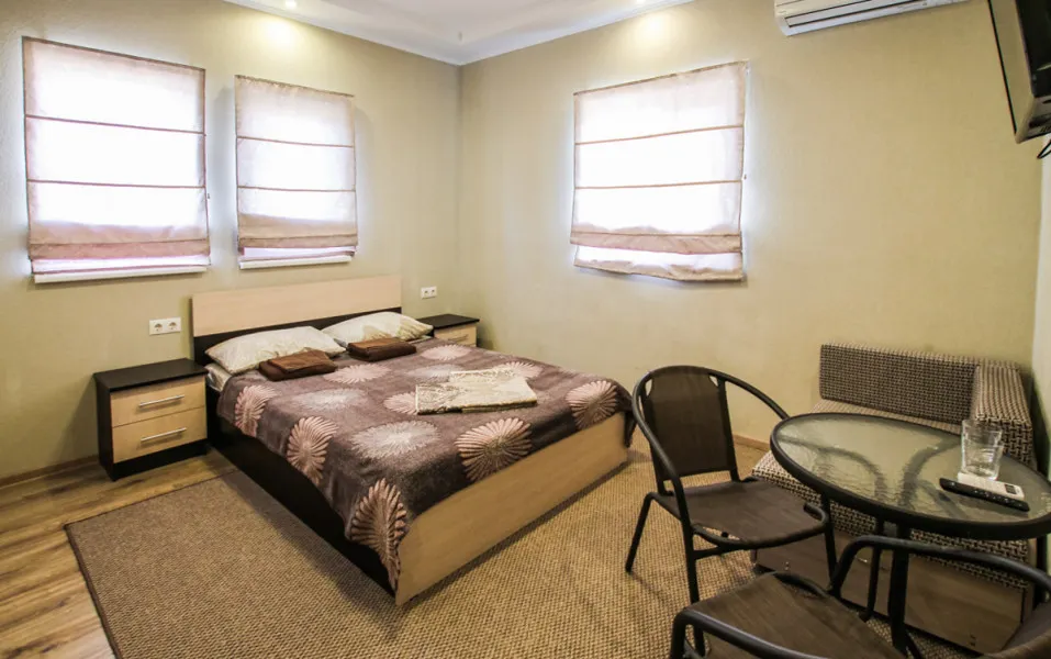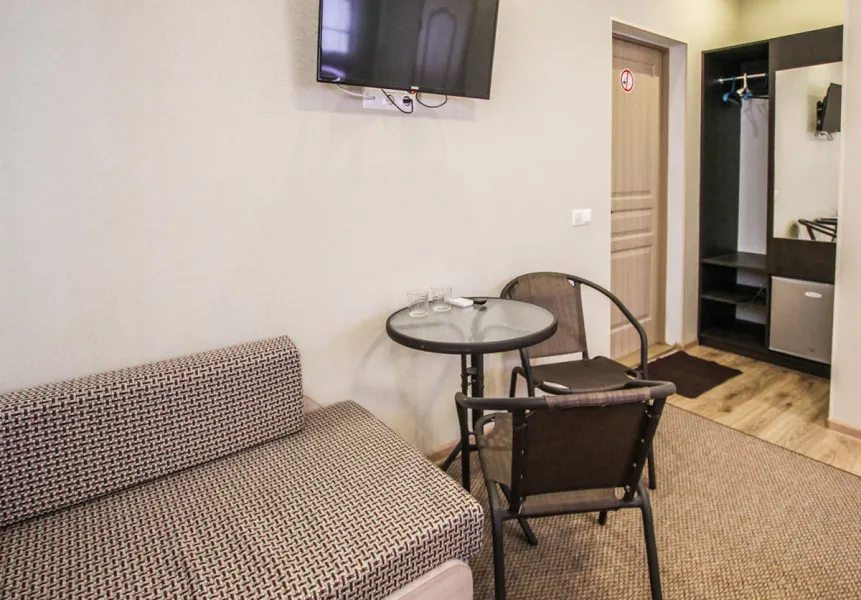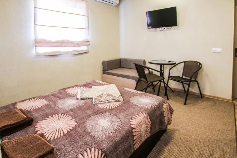 Номер с двухместной кроватью и минидиваном, возможно установить дополнительное место. В номере душ, туалет, телевизор, климат-контроль, холодильник, стол, стулья.